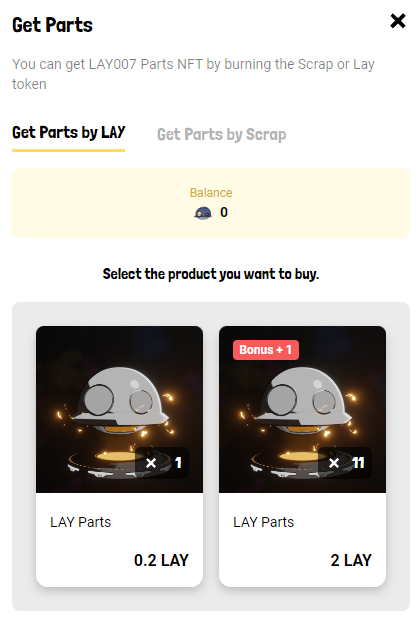 $LAY Price : 0.2 $LAY Result . 70% : 1 part . 30% : 2.5 Scrap.