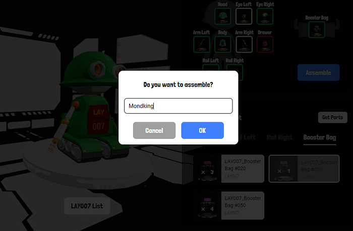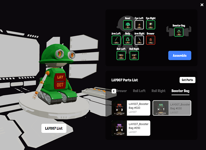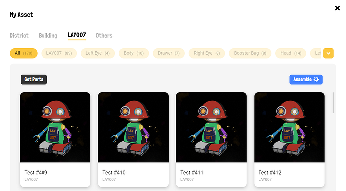 You’ll be able to manage your Lay 007 Robot(NFTs) and its Parts(NFTs). You’ll be able to assemble different colors and forms of Lay Parts. Collect extraordinary parts NFTs to show off and unlock new opportunities. Finally, Name your LAY 007 Robot as a collection.